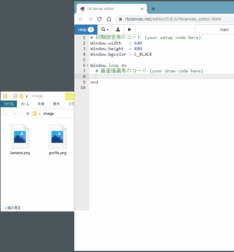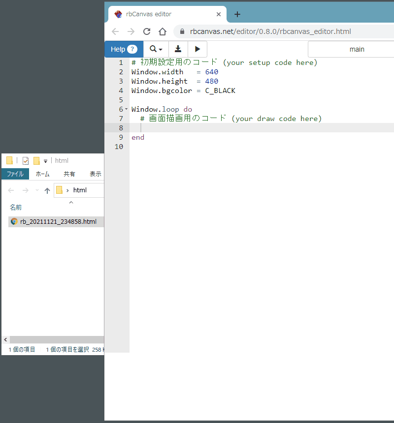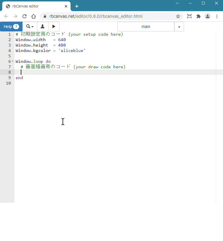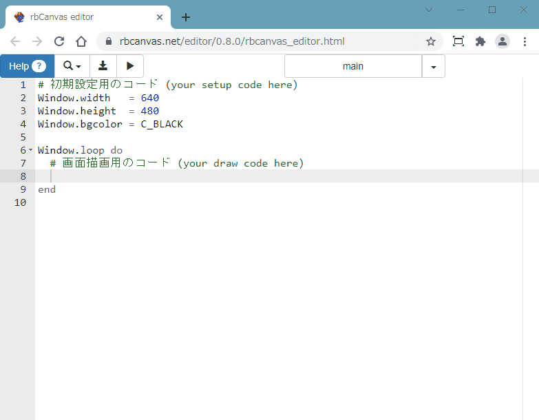rbCanvasエディタは、雛形となるプログラムが最初に記述されています。
